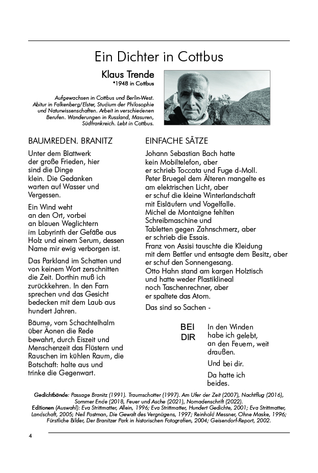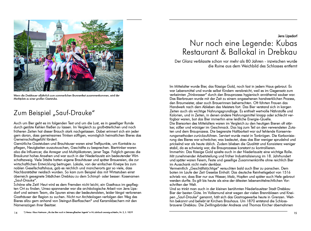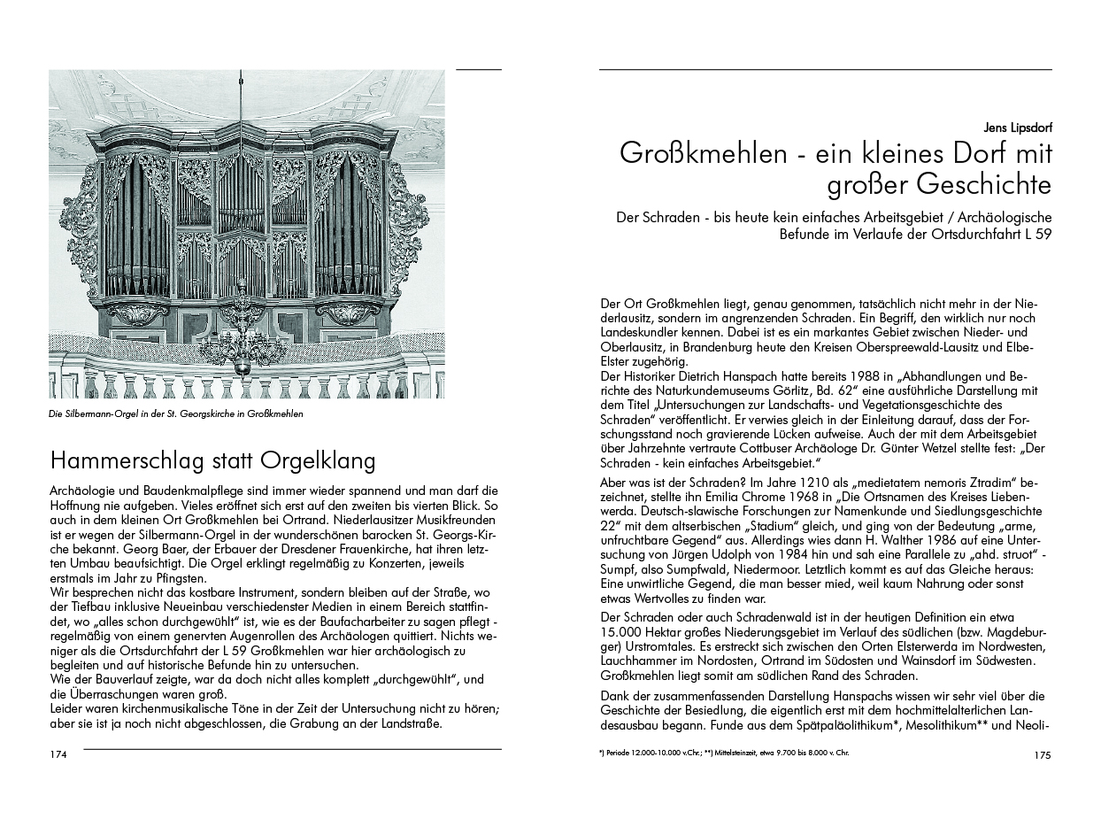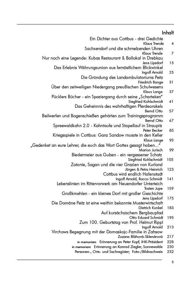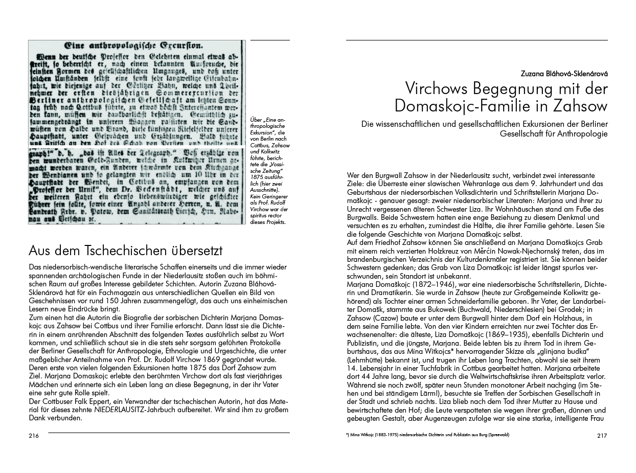 Weiter zurück und auch in die Zukunft reichen die Texte vertrauter und neuer Autoren: Archäologisch ist Jens Lipsdorf in Drebkau und im Schraden unterwegs; in Zahsow holt ihn die tschechische Publizistin Zuzana Bláhová-Sklenárová bei ihrer Begegnung mit Prof. Virchow und Marjana Domaskoje ein.