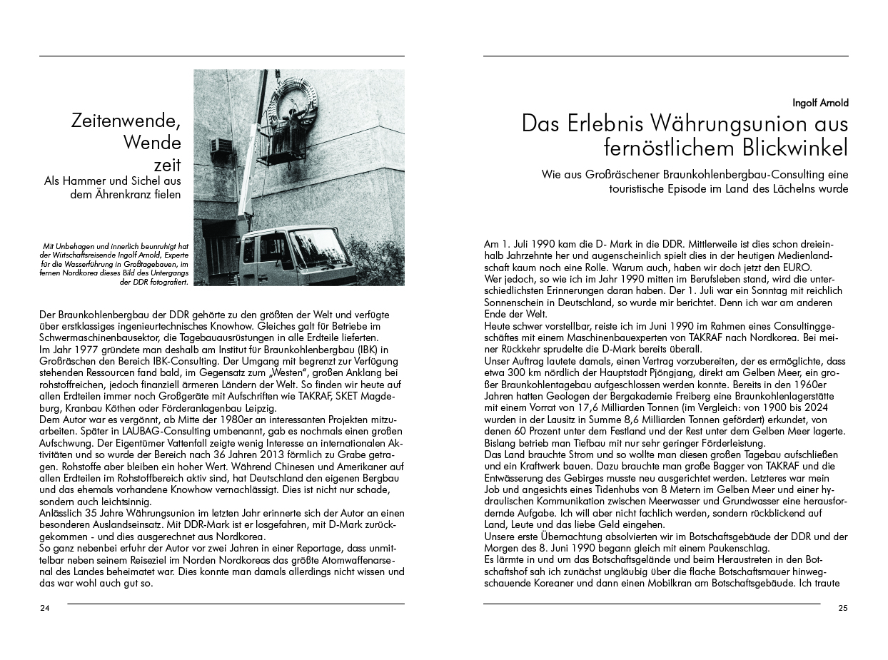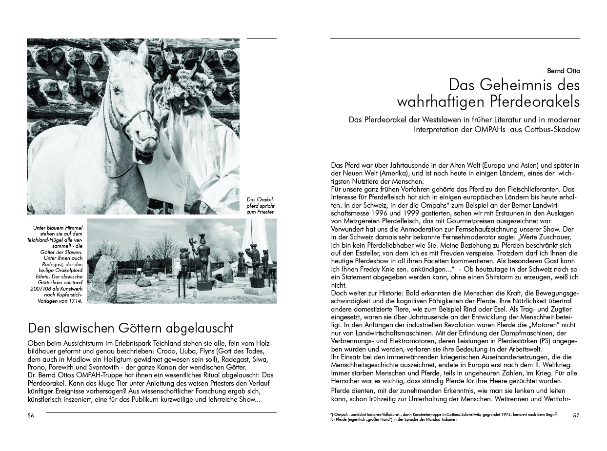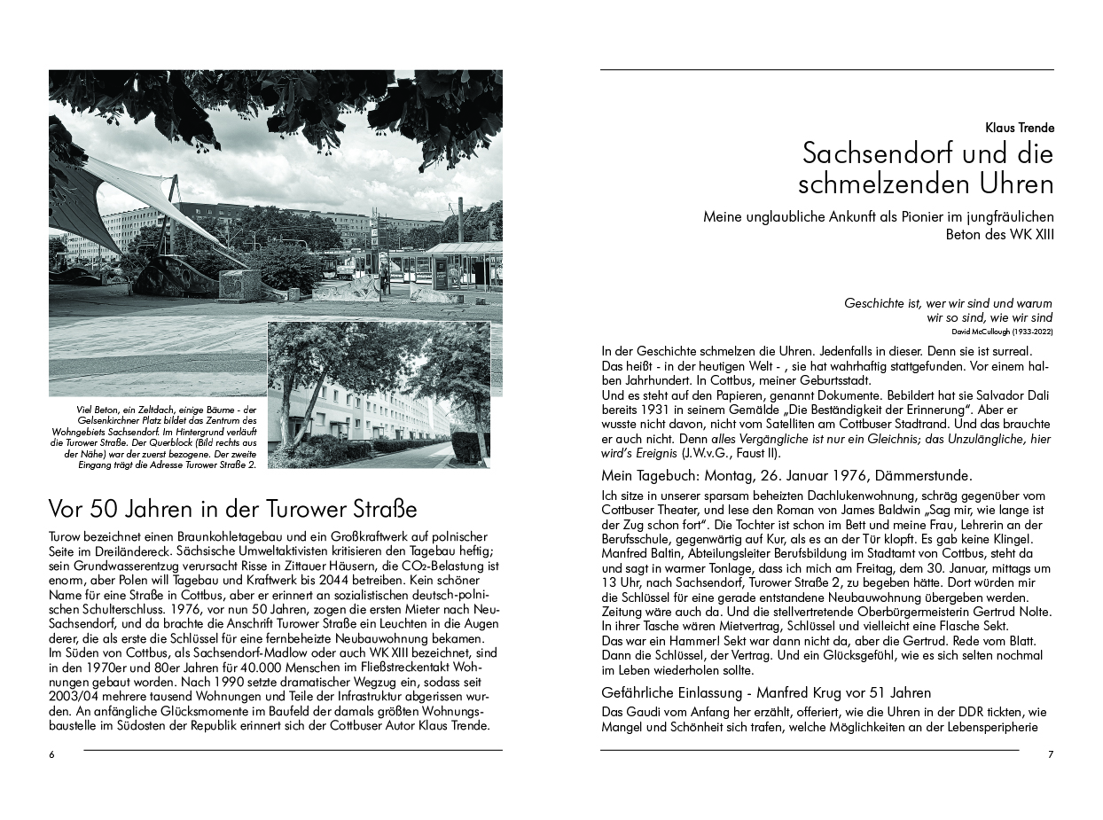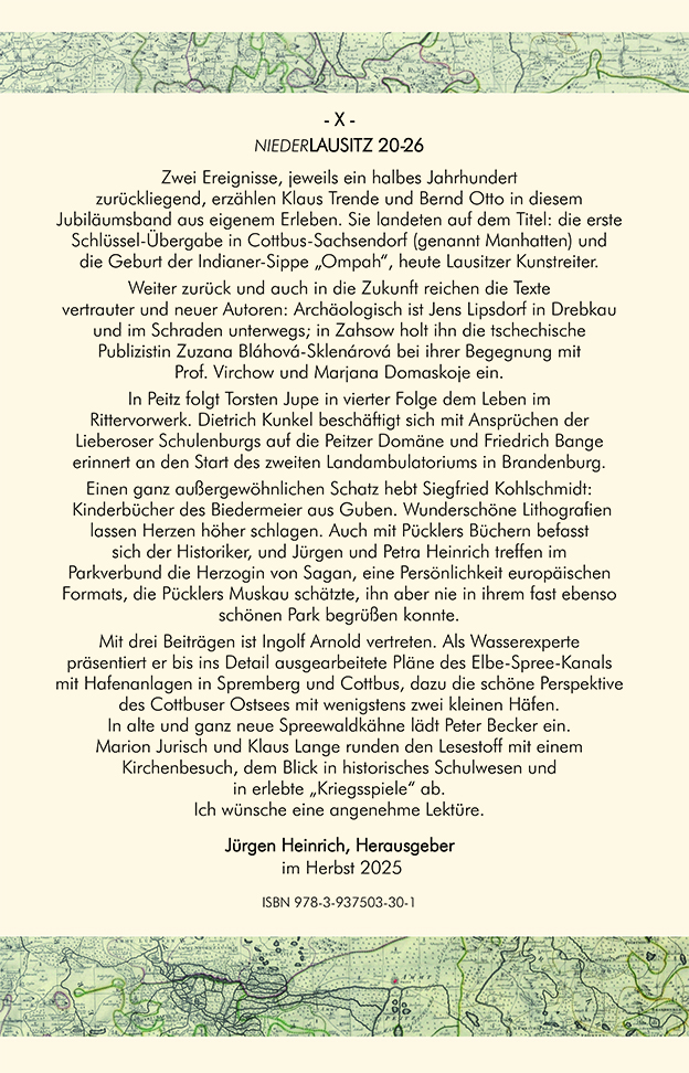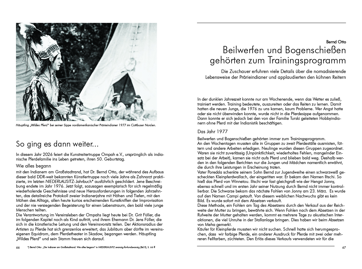 Zwei Ereignisse, jeweils ein halbes Jahrhundert zurückliegend, erzählen Klaus Trende und Bernd Otto in diesem Jubiläumsband aus eigenem Erleben. Sie landeten auf dem Titel: die erste Schlüssel-Übergabe in Cottbus-Sachsendorf (genannt Manhatten) und die Geburt der Indianer-Sippe „Ompah“, heute Lausitzer Kunstreiter.