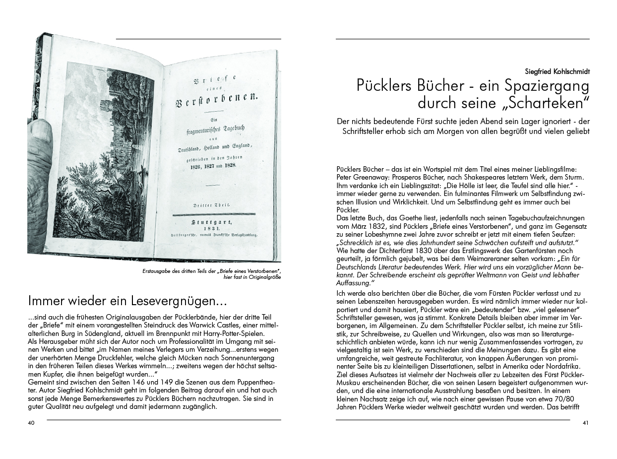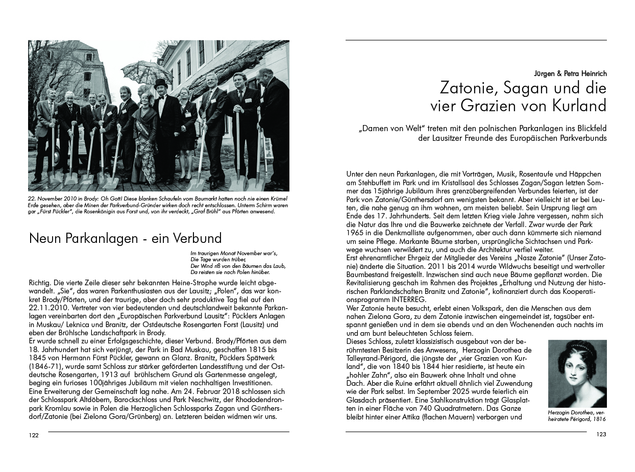 Einen ganz außergewöhnlichen Schatz hebt Siegfried Kohlschmidt: Kinderbücher des Biedermeier aus Guben. Wunderschöne Lithografien lassen Herzen höher schlagen. Auch mit Pücklers Büchern befasst sich der Historiker, und Jürgen und Petra Heinrich treffen im Parkverbund die Herzogin von Sagan, eine Persönlichkeit europäischen Formats, die Pücklers Muskau schätzte, ihn aber nie in ihrem fast ebenso schönen Park begrüßen konnte.